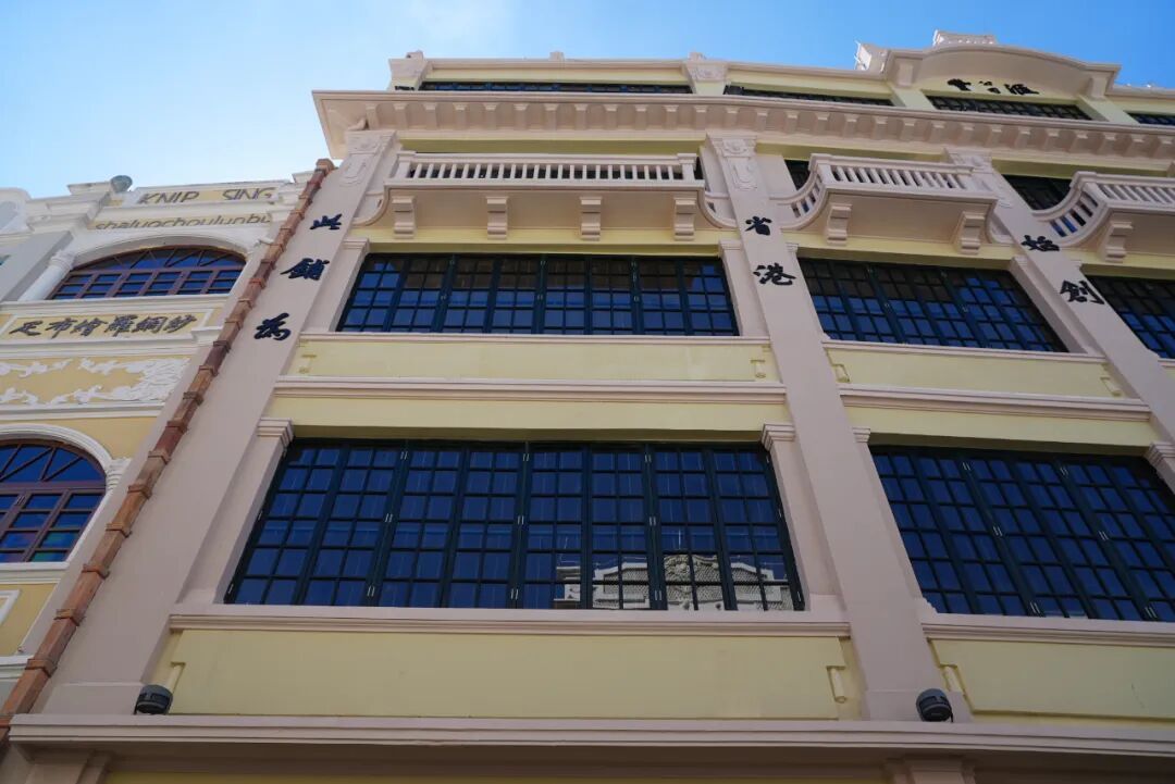 继续往前走,孙文西路100号一栋老旧宿舍楼被拆除,打开一个公共空间。以后游客可以通过这里直接上烟墩山,还与周围建筑第五立面连接起来,形成移步换景的观光体验。在汇丰大楼、中大纱绸罗绘布疋店、先振金铺……灰塑字体重现当年的商号。“这些都是我们对照20世纪30年代和40年代的老照片做出来的”,中山市石岐街道香山古城保护活化中心主任田湘攸介绍。