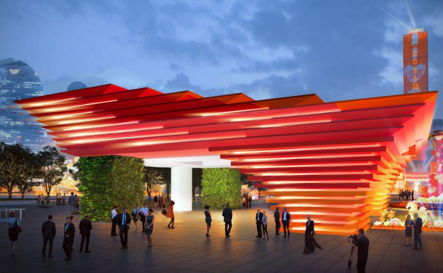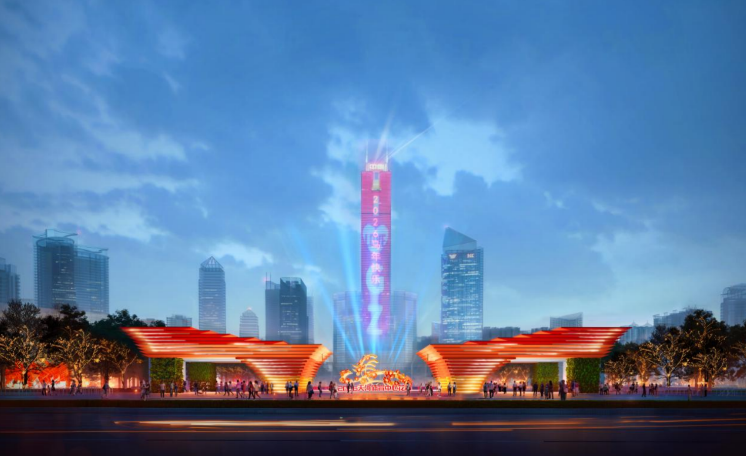 牌楼在色彩与工艺设计上极具匠心,实现了传统与现代的巧妙碰撞。色彩采用传统正红与金色渐变,将营造出旭日映波的新春喜庆氛围;工艺上融合现代软膜幻彩灯箱、流动投光光带等前沿技术,未来将实现牌楼白天庄重典雅、夜晚华光四溢的视觉效果,既传承了传统牌楼宫灯意向,又展现了天河领先的创新科技。两侧鹏翼造型的每层飞檐,均嵌入可编程流动灯带。通过智能控制系统,灯光如数据流般奔腾循环、往复不息,生动演绎智慧城区的澎湃心跳。流光溢彩间,宛若星光倾洒,恰似天河展翼,光影交织中传递出时代的韵律与活力。