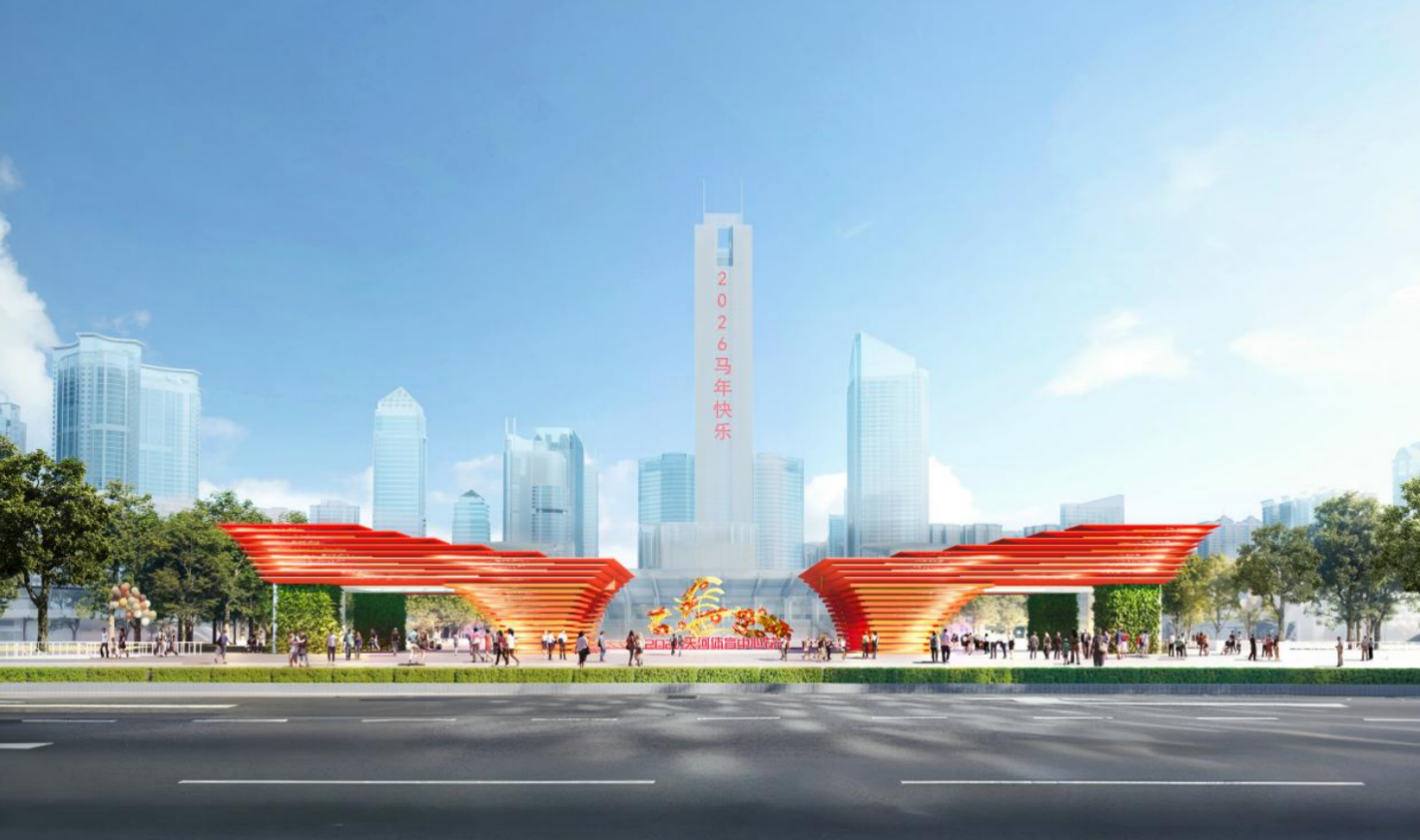 牌楼中央设置“红棉飞马”雕塑造型,以行云流水的书法“马”字为骨架,既契合2026年丙午“火马”年的生肖特质,其造型又似腾跃的浪花,暗合天河区与珠江水脉的历史基因和文化脉络。66朵金红木棉簇拥其上,如烈火,如冠冕,在光影中绚烂绽放。骏马的矫健、红棉的热烈、汉字的韵味在此交融,凝练为“红棉花开·飞马亮翼”的动人画卷。这不仅是吉祥的年景,更是天河区在新时代奔腾向前、力争上游的精神图腾,与体育竞技追求卓越的内核同频共振。