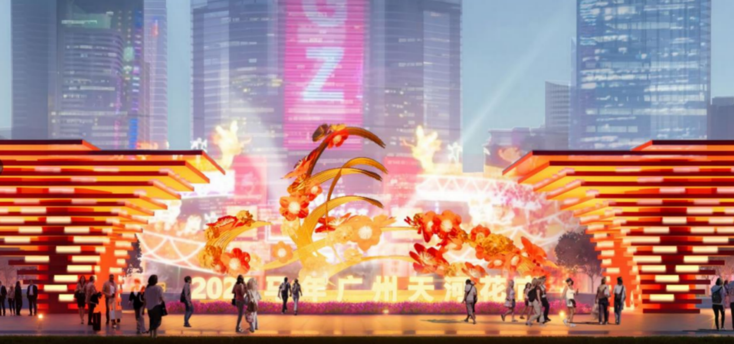 2026年天河区迎春花市以牌楼为起点,采用与城市中轴线对称的布局方案,沿中心花海次第铺展、层层深入,最终汇聚于花海尽端的全运主题景观区,整体空间环环相扣、意境贯通,寓意“马到功成”。